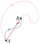 ![]() 두 점을 잇는 세 가지 경로의 이동거리는 다르지만 변위는 모두 같다. |