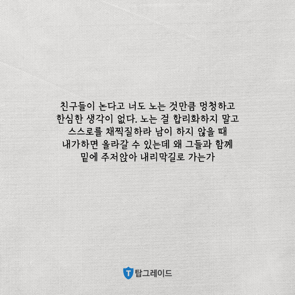 공부명언 친구들이 논다고 너도 노는 것만큼 멍청하고 한심한 생각이 없다. 노는 걸 합리화하지 말고 스스로를 채찍질하라 남이 하지 않을 때 내가하면 올라갈 수 있는데 왜 그들과 함께 밑에 주저앉아 내리막길로 가는가 대학 생활(Uni Life) 2023.06.27