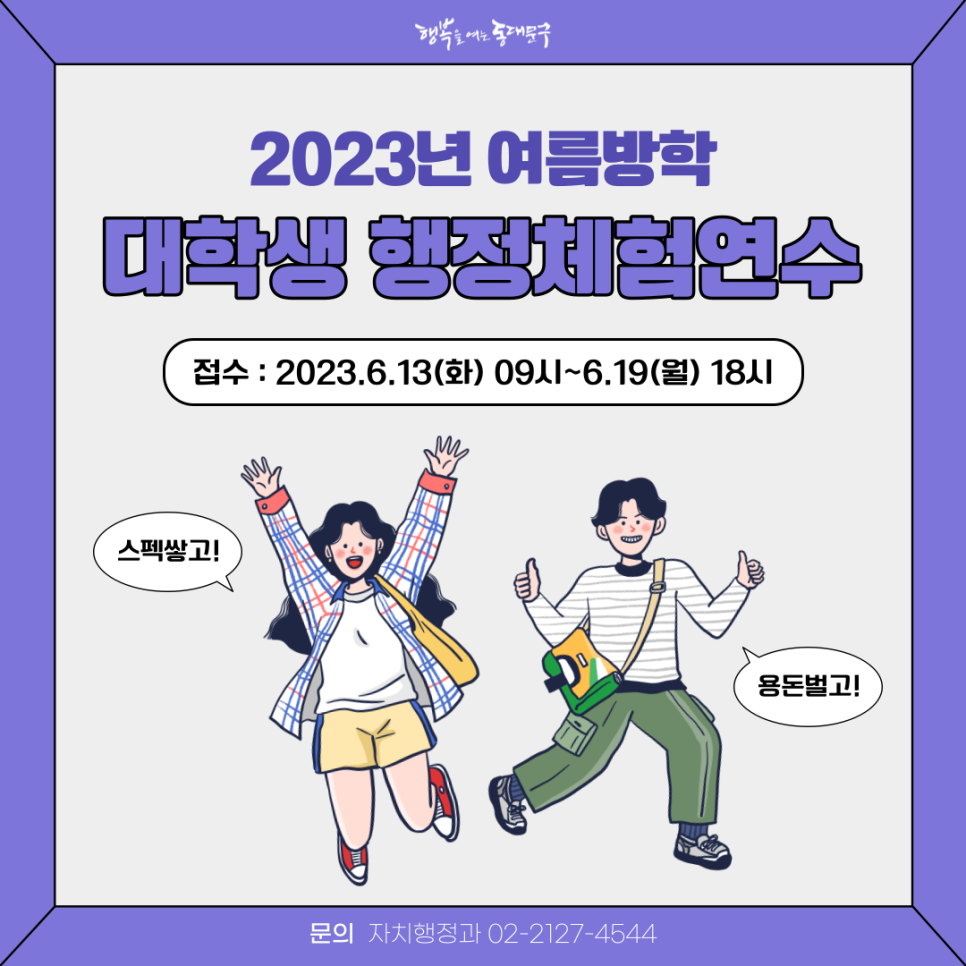 여름방학에 놀면 뭐하니❓ 2023 동대문구 여름방학 대학생 행정체험연수 신청 안내! 여름방학에 놀면 뭐하니❓ 2023 동대문구 여름방학 대학생 행정체험연수 참여하자! 아직 여름방학 계획이 없다면 관공사 아르바이트로 스펙 쌓고 용돈도 벌어요✨ 접수기간 : 6.13(화) 09시 ~ 6.19(월) 18시 접수방법 : 동대문구청 누리집 신청 제출서류 : 신분증 사본, 재학증명서, 주민등록초본 자세한 사항은 동대문구청 공식 블로그 또는 사이트를 참고해주세요! 문의 : 동대문구 자치행정과 02-2127-4544 대학 생활(Uni Life) 2023.06.13