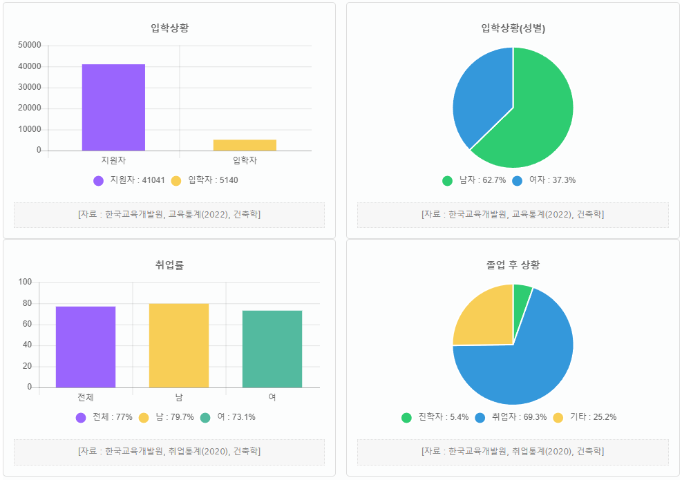 대학교 학과 소개 - 건축학과 ​ 학과개요 휴식과 편안함을 주는 집과 일을 하는 직장, 공부를 할 수 있는 학교와 학원, 식사와 쇼핑을 할 수 있는 상점 등에서 우리는 하루도 빠짐없이 수많은 건축물을 이용하고 있습니다. 건축학과에서는 우리가 외부 환경으로부터 보호받고, 사용 목적과 용도에 따라 건축물을 편리하고 쉽고 편안하게 이용할 수 있도록 건축물을 설계하고 만드는 방법에 대해 배웁니다. 건축학과는 역사, 문화, 예술, 인문학적 지식과 건축 관련 전문적 지식까지 종합적인 이론과 실습을 바탕으로 건축물을 만들 수 있는 인재를 양성하는 학과입니다. ​ 학과특성 건축ㆍ건설 기술은 우리 생활과 삶의 방식을 기초로 빠르게 발전하여 다양화, 첨단화, 정보화되고 있습니다. 건축 설계에 따른 구조 설계, 건축 시공과..