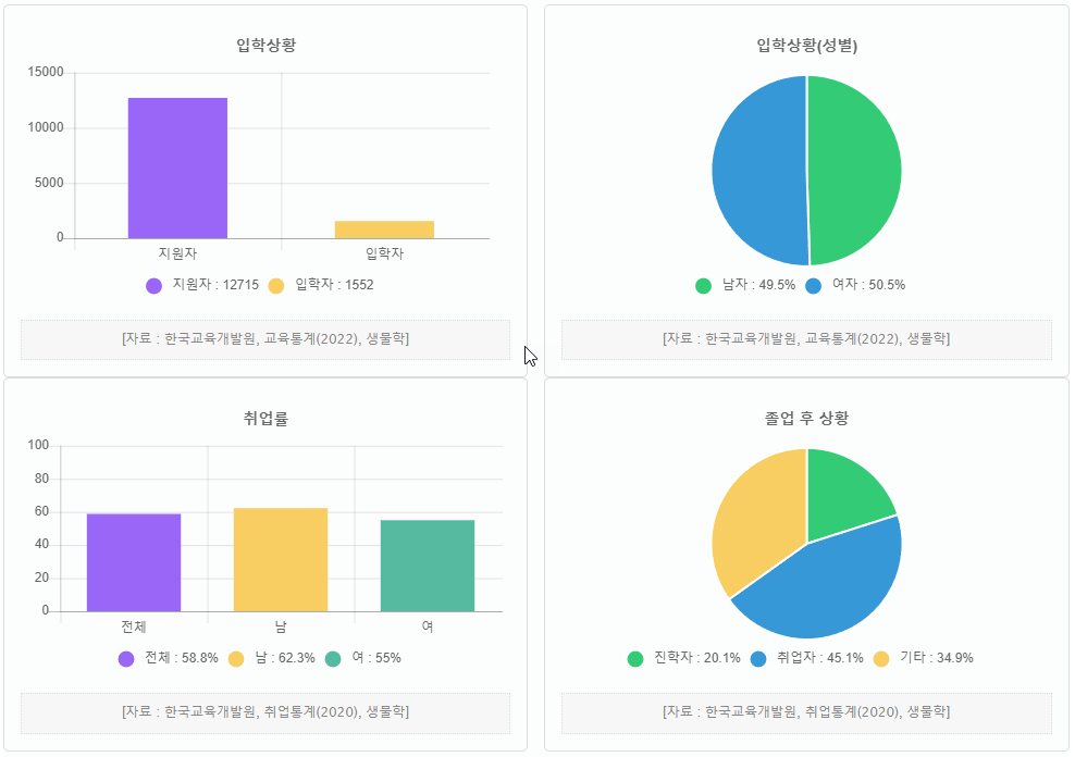 대학교 학과 소개 - 생물학과 ​ 학과개요 유전자 분자 구조가 밝혀진 이래 현대 생물학은 눈부신 발전을 하였습니다. 생물학과는 세포학, 분류학, 발생학, 생리학 등을 기반으로 생명 현상을 탐구하며 그 원리에 대해서 자세히 공부합니다. 생물학과는 생물에 대한 기초 지식과 이론을 체계적으로 이해하고 자연 생태계와 생명 현상을 탐구하는 전문 인력을 기르는 곳입니다. ​ 학과특성 최근 생물학과는 첨단 과학의 접근 방법을 사용하여생명 현상의 본질을 탐구합니다. 기본 생물학 교과외에도 분자생물학, 유전공학, 면역학 등 생명과학을 공부합니다. 특히, 최근 DNA 마이크로칩, 생명정보과학, 조직재생공학과 같은 의생명과학 분야나 생태환경과학 분야도 특성화되고 있습니다. ​ 흥미와 적성 평소에 식물, 동물 및 인간의 생명..